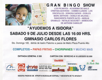 El próximo sábado 09 de julio a partir de las 16:00 hrs. Se llevara a efecto una gran obra benéfica en ayuda de Isidora Páscale Maraboli. Ella es una niña de tan solo 9 meses de edad la cual padece una enfermedad llamada AMEI (atrofia medular espinal), para la ocasión se efectuara un GRAN BINGO SHOW la cual tendrá grandes sorpresas e invitados. Entre los cuales participaran de esta hermosa cruzada estarán: los Dobles de Arjona, Marck Anthony, Y la rancherita de Puente Alto, el Grupo los discípulos, el grupo los picantes además la bailarina Retelie Beauchamp ex muralla infernal, Enzi del programa YINGO el gran empresario y conductor de televisión del programa LA HORA PYME Carlos Pontigo junto a su coanimadora Noelia Gramajo ex chica YINGO, OMARCITO GARATE de radio colocolo entre otros.