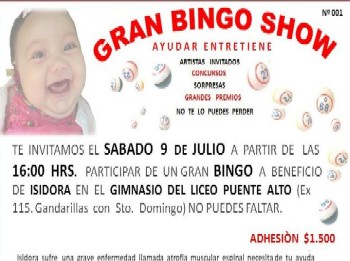El próximo sábado 09 de julio a partir de las 16:00 hrs. Se llevara a efecto una gran obra benéfica en ayuda de Isidora Páscale Maraboli. Ella es una niña de tan solo 9 meses de edad la cual padece una enfermedad llamada AMEI (atrofia medular espinal), para la ocasión se efectuara un GRAN BINGO SHOW la cual tendrá grandes sorpresas e invitados. Entre los cuales participaran de esta hermosa cruzada estarán: los Dobles de Arjona, Marck Anthony, Y la rancherita de Puente Alto, el Grupo los discípulos, el grupo los picantes además la bailarina Retelie Beauchamp ex muralla infernal, Enzi del programa YINGO el gran empresario y conductor de televisión del programa LA HORA PYME Carlos Pontigo junto a su coanimadora Noelia Gramajo ex chica YINGO, OMARCITO GARATE de radio colocolo entre otros.